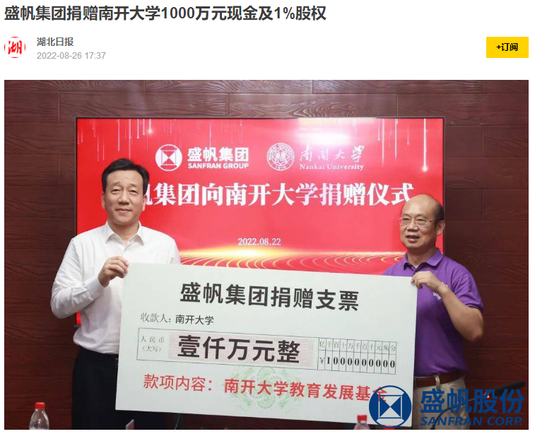 4月22日,盛帆企业团与南放大招学在武汉市签了捐给和谈,盛帆企业团往南放大招学捐给1000多万元银行存款和1%股本,两面打开强度协同合作。盛帆···